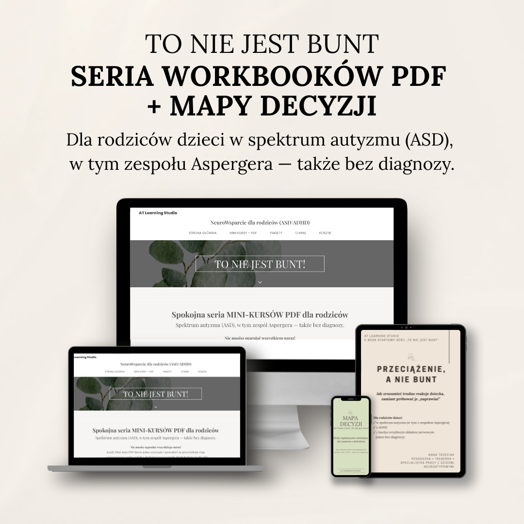 Workbooki PDF do przejścia w Twoim tempie: krótkie lekcje + mapa decyzji na trudny moment.