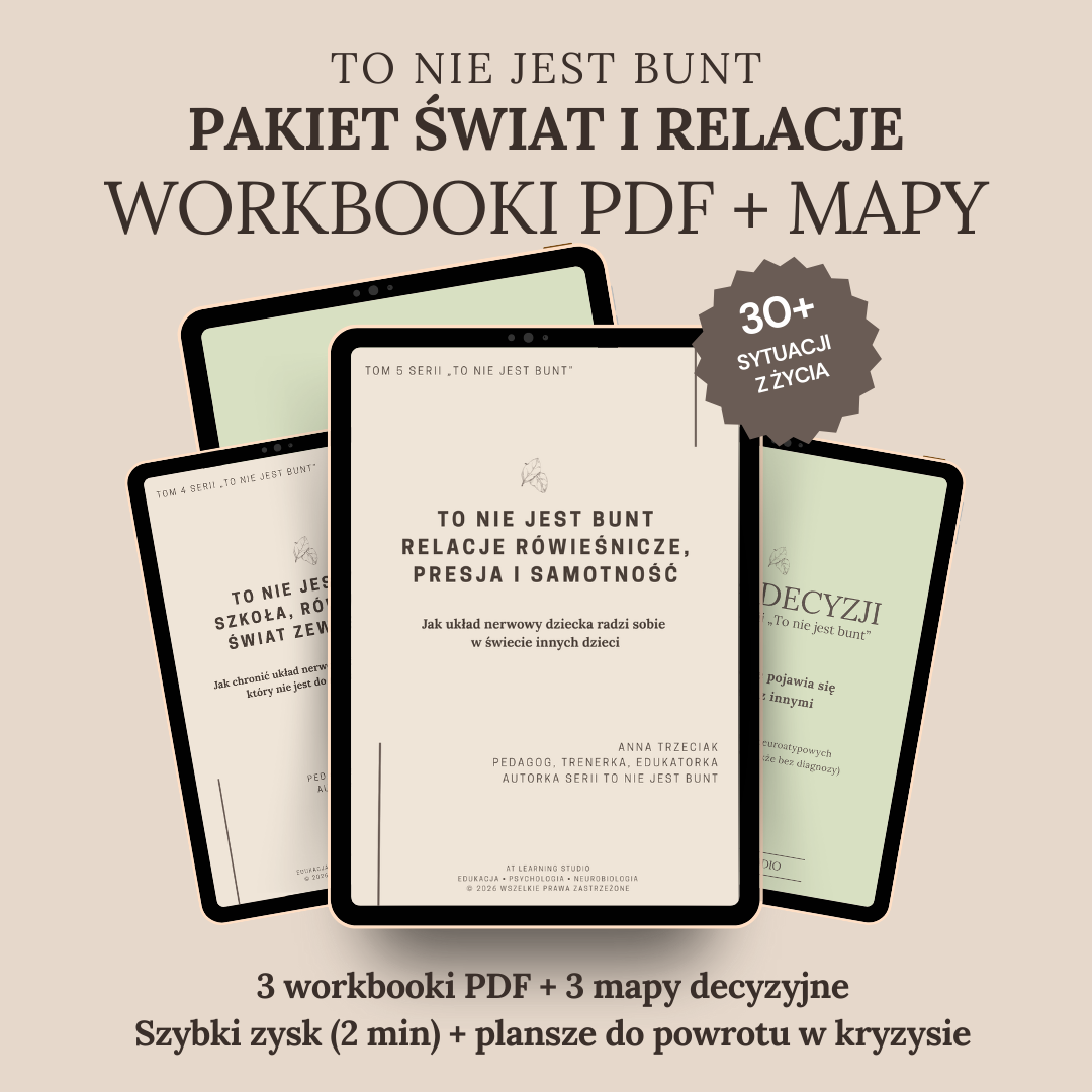 3 workbooki PDF + 3 mapy decyzji o szkole, relacjach rówieśniczych i zasobach rodzica