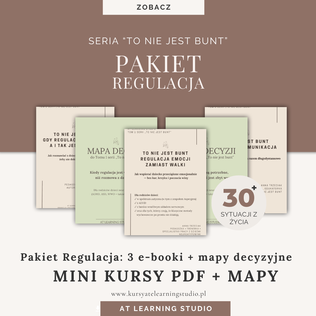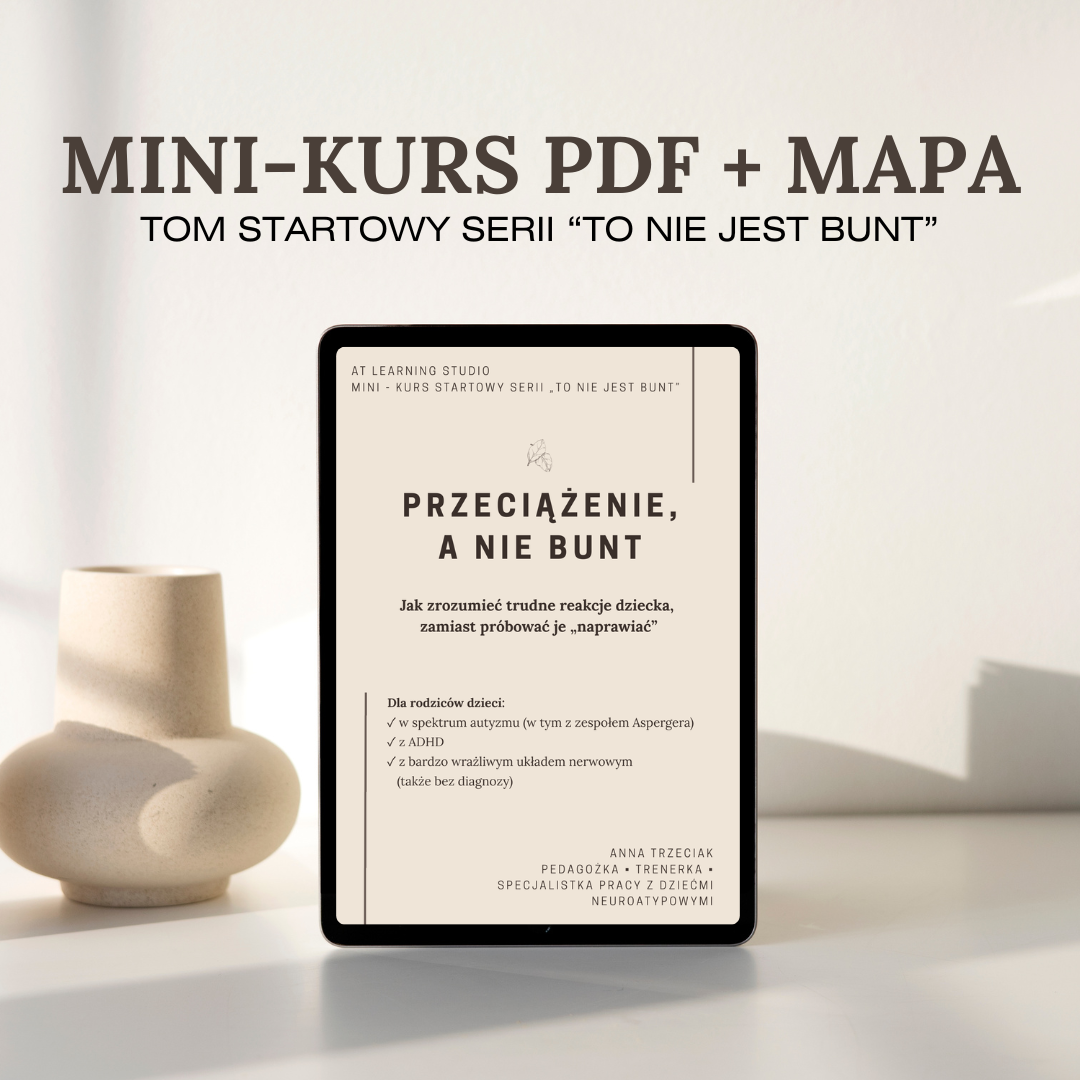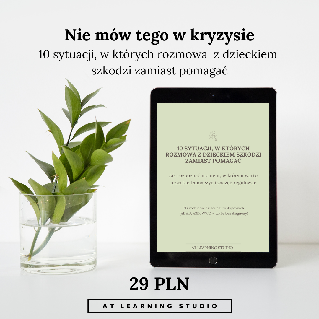 Ten krótki e-book to spokojny start dla rodziców dzieci neuroatypowych (ADHD, ASD / zespół Aspergera — także bez diagnozy). Dostajesz 10 momentów, w których rozmowa zwykle szkodzi zamiast pomagać — i dzięki temu szybciej rozpoznasz, kiedy odpuścić słowa, a zadbać o regulację.